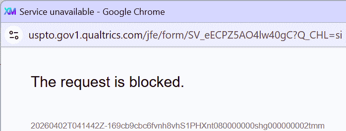 click to enlarge April 1, 2026 – CO – I am logged in at Patent Center. Eventually a popup window appears, inviting me to click to respond to a user survey about my experience with Patent Center. What happens next is this. Note that in keeping with recent tradition with the developers of Patent Center, the error message is a value subtractor. No clue what to do next.